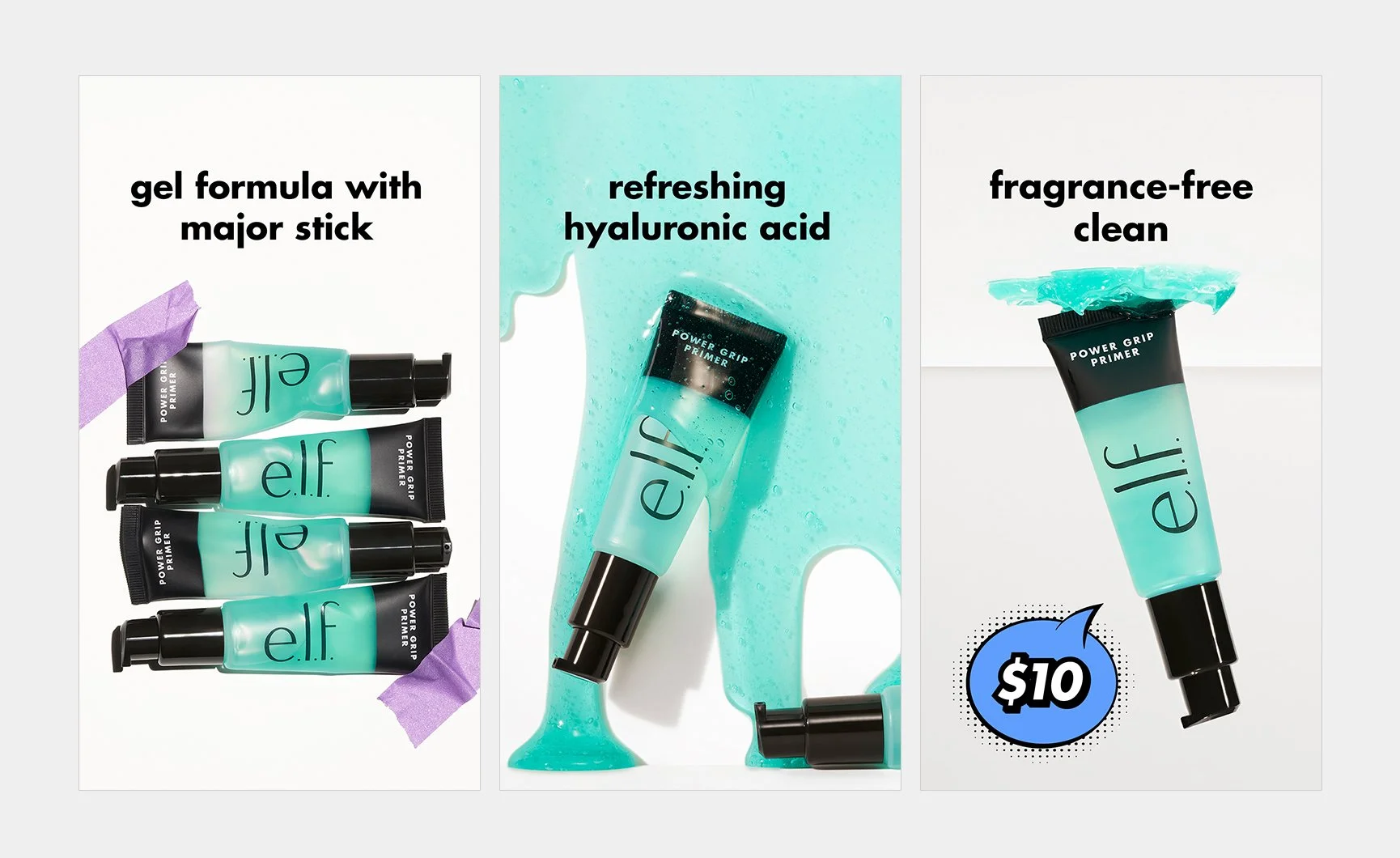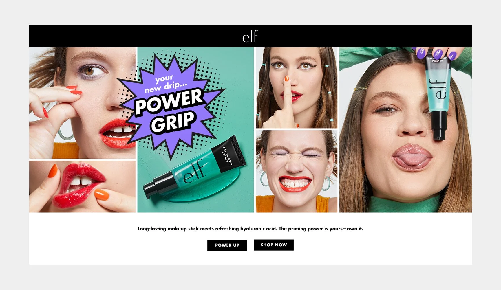 Meet your new drip - Power Grip! A gel-based, hydrating face primer that smoothes skin while gripping your makeup. Enriched with refreshing hyaluronic acid and a fragrance-free clean. Pair it with budge-proof formulas to keep your looks on lock.